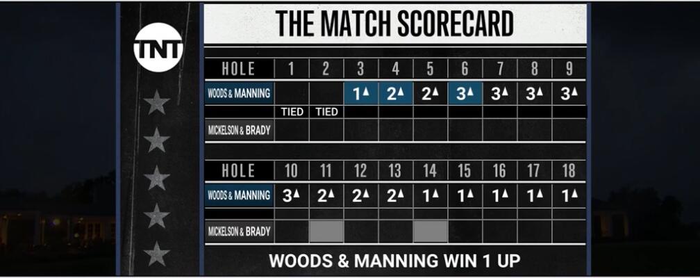比賽因為下雨推遲了一個小時才開打,前9洞采用四人四球賽形式,在現(xiàn)場主持人Samuel L. Jackson的介紹之后,曼寧和布雷迪的開球紛紛失誤,老米同樣錯失了球道,伍茲上了球道但是沒有把球送上果嶺的右側(cè)。前2個洞雙方都沒有下分,554碼的3號洞,伍茲開球成功上球道,為他的慈善基金會賺得了150萬美元的獎金,布雷迪和曼寧的開球都再度進(jìn)入了樹叢,不得不重新開球,再度出局。伍茲的發(fā)揮很穩(wěn)健,他的第二桿貫穿球道,成功抓下了小鳥球,老米則錯過了保帕推,伍茲/曼寧以1洞領(lǐng)先。