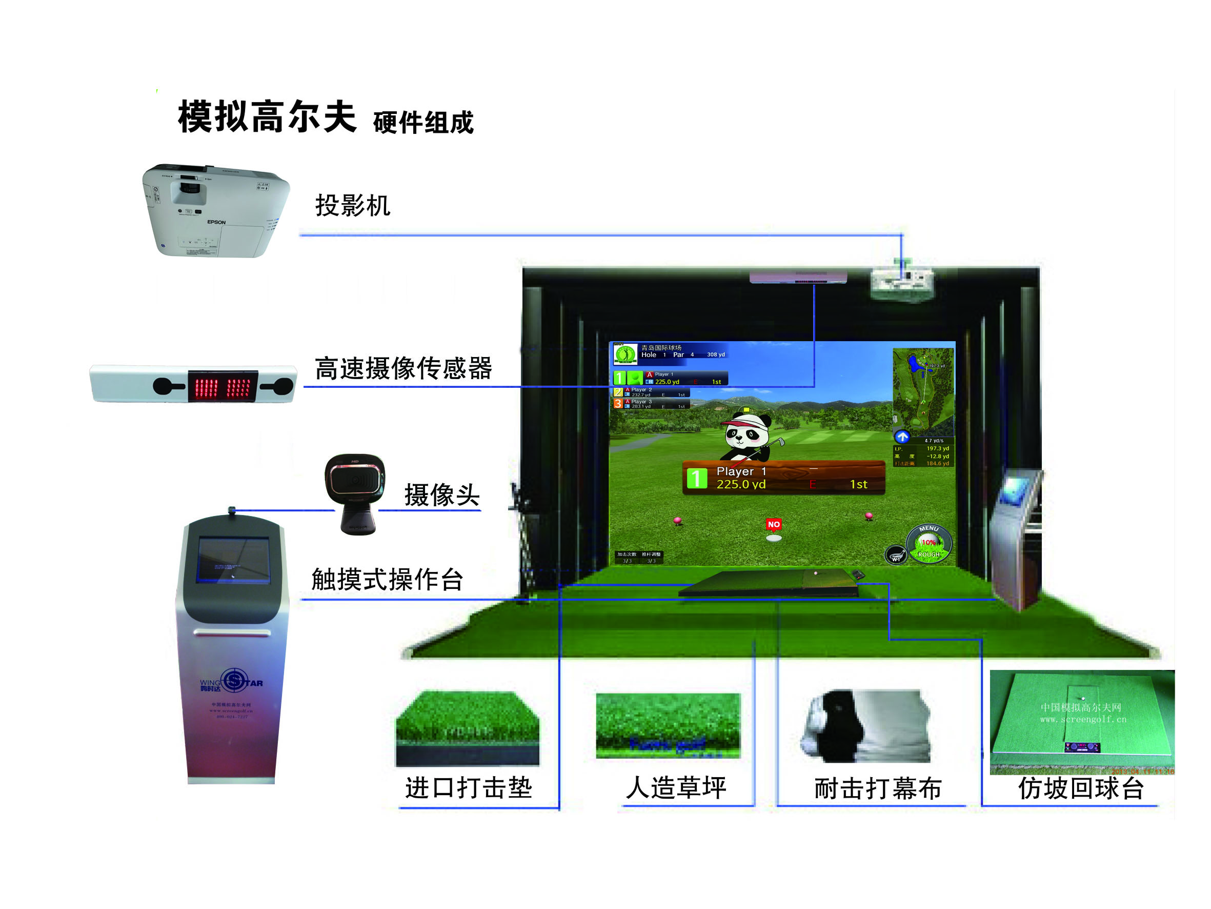 模擬高爾夫(亦稱(chēng)虛擬高爾夫或屏幕高爾夫),是在高爾夫球基礎(chǔ)上,因計(jì)算機(jī)技術(shù)而創(chuàng)新發(fā)展起來(lái)的運(yùn)動(dòng),模擬高爾夫利用計(jì)算機(jī)情景模擬技術(shù)將室外真實(shí)的高爾夫球場(chǎng)模擬設(shè)計(jì)到一套軟件系統(tǒng)中,并通過(guò)投影機(jī)投影展現(xiàn)在球手面前的(一個(gè)或三個(gè))幕布上,同時(shí)通過(guò)傳感器對(duì)球手擊出的球的飛行數(shù)據(jù)進(jìn)行采集分析,并時(shí)時(shí)將所擊出球的實(shí)際飛行軌跡在投影幕布上顯示出來(lái)。模擬高爾夫使用真實(shí)的高爾夫球和球桿,在30-40平方米的室內(nèi)打位上實(shí)現(xiàn)球手和球場(chǎng)場(chǎng)景的互動(dòng):球手與在室外真實(shí)擊球時(shí)一樣揮桿,向幕布中的球場(chǎng)擊球;畫(huà)面顯示出與真實(shí)球場(chǎng)一樣的視覺(jué)感觀,球的飛行角度、旋轉(zhuǎn)量,旋轉(zhuǎn)軸,左右出發(fā)角度、飛行距離、彈跳,球桿速度,桿面角度,球桿路徑等與在真實(shí)球場(chǎng)打球時(shí)一樣逼真。身處異地的高爾夫愛(ài)好者可以通過(guò)模擬高爾夫進(jìn)行在線比賽,初學(xué)者可以通過(guò)模擬高爾夫的系統(tǒng)軟件進(jìn)行姿勢(shì)校正,模擬高爾夫也是球手體驗(yàn)在不同國(guó)際標(biāo)準(zhǔn)球場(chǎng)打球感受的好方法。此系統(tǒng)可以起到真實(shí)體驗(yàn)、練習(xí)和教學(xué)的目的,同時(shí)球手不用長(zhǎng)途跋涉到離都市很遠(yuǎn)的球場(chǎng),也不用受雨雪等天氣因素的影響,特別是在冬季室外球場(chǎng)不能打球的時(shí)期,室內(nèi)模擬高爾夫是最佳的打球選擇!由于模擬高爾夫造價(jià)低、使用空間小、運(yùn)行成本低、不存在安全問(wèn)題、方便升級(jí)換代,適合現(xiàn)在越來(lái)越忙碌的都市生活,現(xiàn)已成為高球愛(ài)好者的新寵,目前正在世界各地廣泛流行起來(lái)。